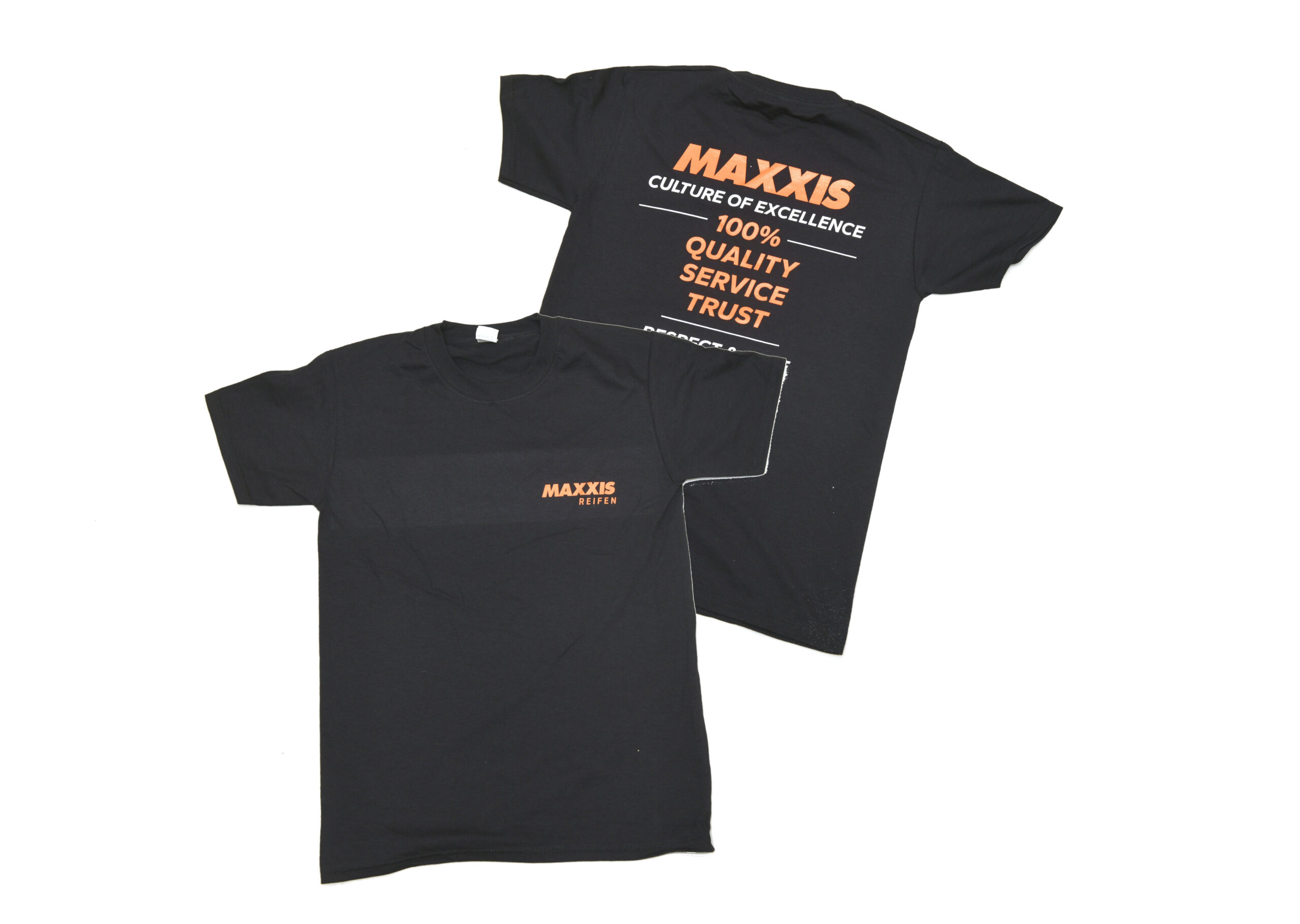 Das schwarze Maxxis-T-Shirt in der Größe „L“ – vorne ein kleiner Druck mit dem Firmenloge und hinten in groß ein wenig die dazugehörige Philosophie (siehe Bild). Und das nicht nur für einen Gewinner, sondern gleich dreimal!.